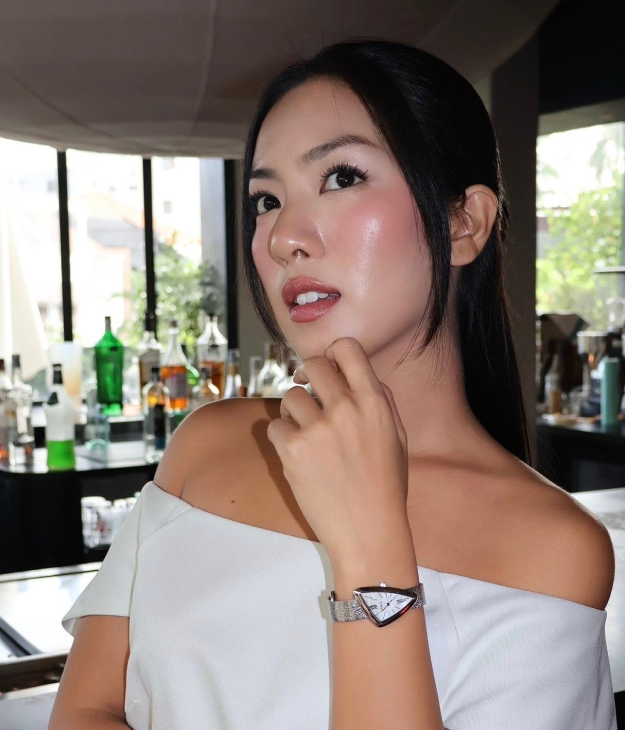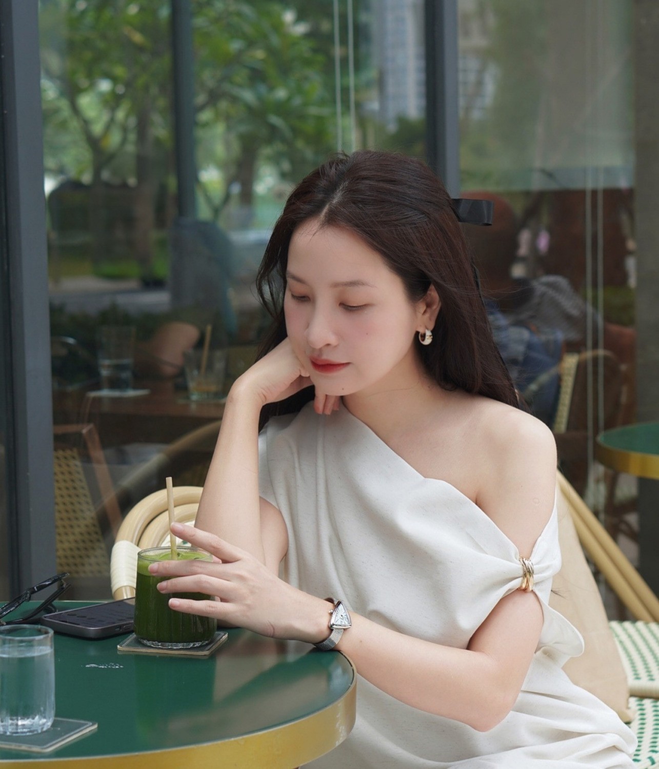 Trong buổi trò chuyện với Saga, diễn viên Kim Nhã đã phối đồng hồ bản dây mesh cùng chiếc váy trắng trang nhã với thiết kế trễ vai. Sự phối hợp này giúp cho nàng diễn viên của chúng ta trở nên vô cùng thanh lịch, duyên dáng nhưng vẫn quyến rũ.