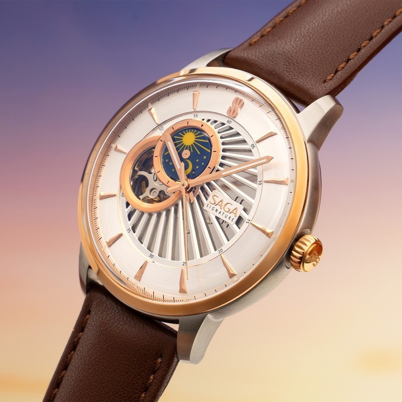 Với sự kết hợp tinh tế giữa chức năng Sun & Moon trực quan cùng thiết kế Open Heart đầy nghệ thuật, đồng hồ nam Saga trở thành một tác phẩm cơ khí sống động trên cổ tay.