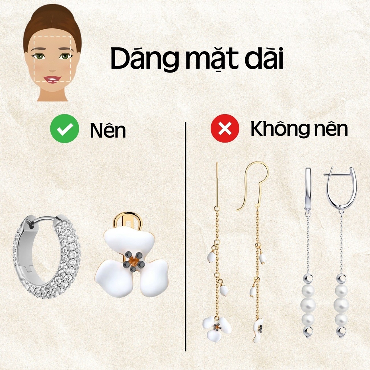 Với dáng mặt này, gần như mọi kiểu bông tai đều có thể tỏa sáng trên gương mặt bạn. Thiết kế vòng lớn, bông tai chùm nghệ thuật hay mẫu dáng thả bản rộng sẽ giúp bạn tận dụng chiều dài sẵn có. Chúng đồng thời tạo thêm sự cân đối về chiều ngang. Nhờ vậy, tổng thể gương mặt trở nên hài hòa, nổi bật hơn.