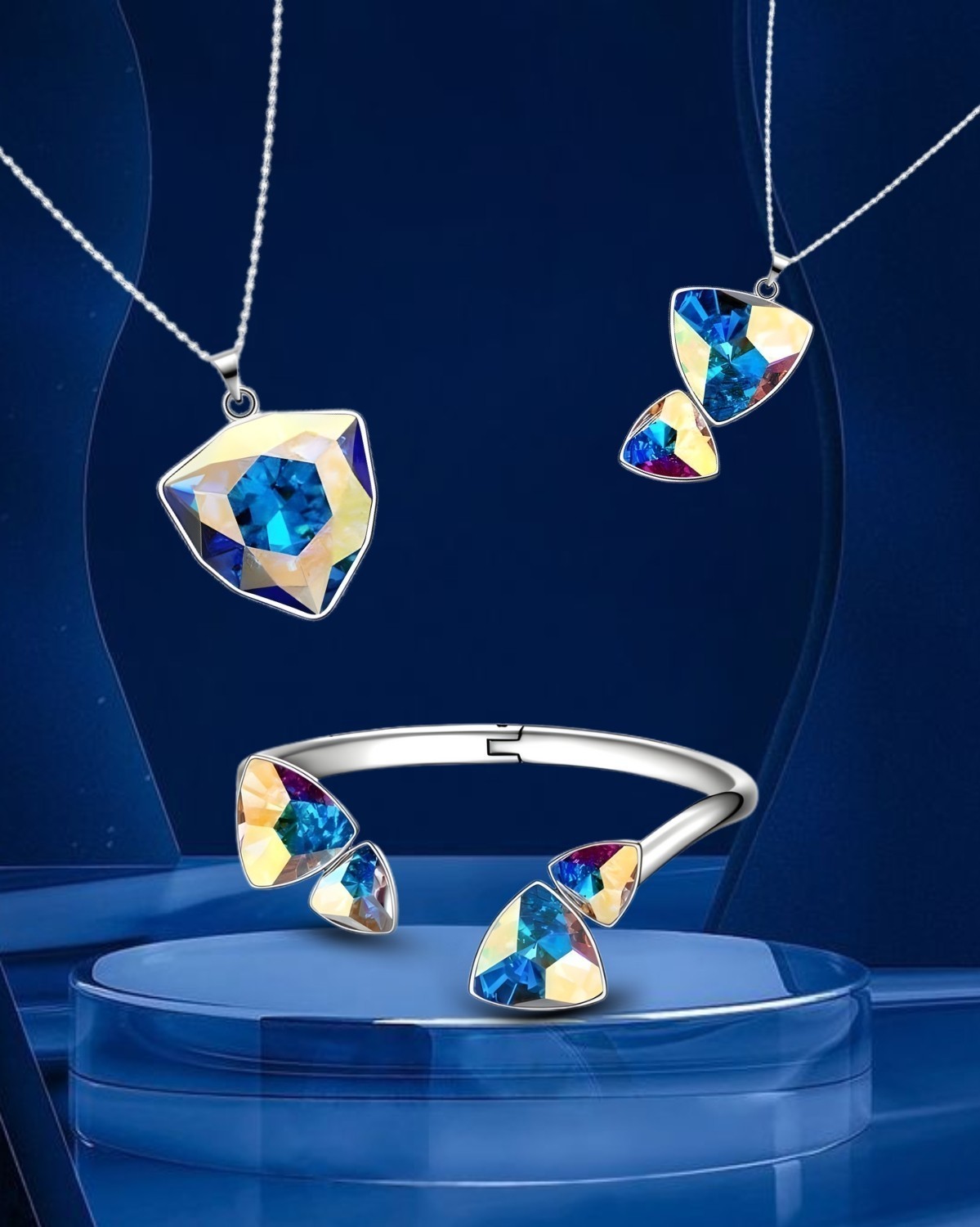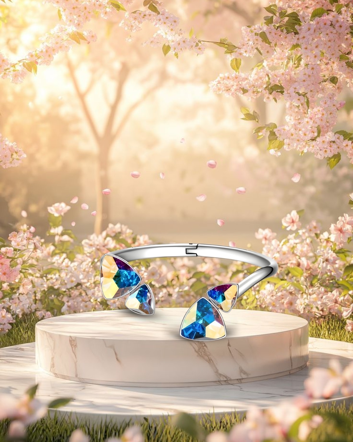 Hai đầu vòng đính những viên pha lê dáng tam giác Reuleaux độc đáo, một hình khối hiếm gặp trong chế tác trang sức. Mỗi viên đều được cắt gọt chuẩn xác đến từng vi cạnh, độ hoàn thiện sắc nét chẳng kém gì một viên kim cương thực thụ.