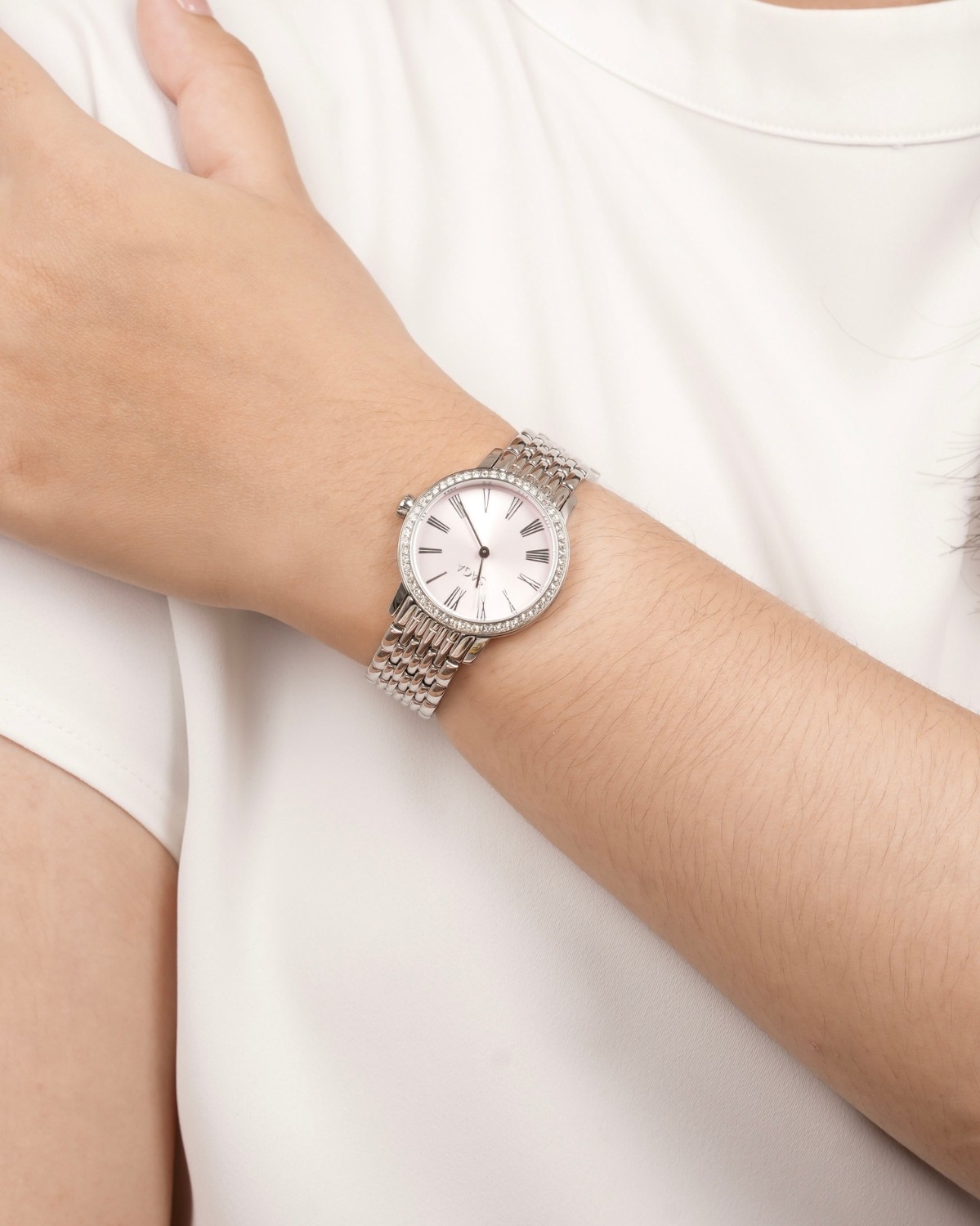 Như giọt sương mai đọng trên cánh hoa, từng viên pha lê được đính tỉ mỉ quanh viền bezel ánh bạc nâng niu mặt số hồng baby. Không quá lấp lánh để gây choáng ngợp, mà vừa đủ để tỏa sáng như khí chất riêng của một nàng tiểu thư đài các – nhẹ nhàng, tinh tế nhưng đầy sức hút.
